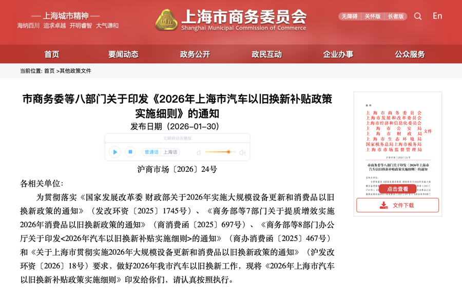 1月底,上海市商务委等八部门关于印发《2026年上海市汽车以旧换新补贴政策实施细则》的通知。